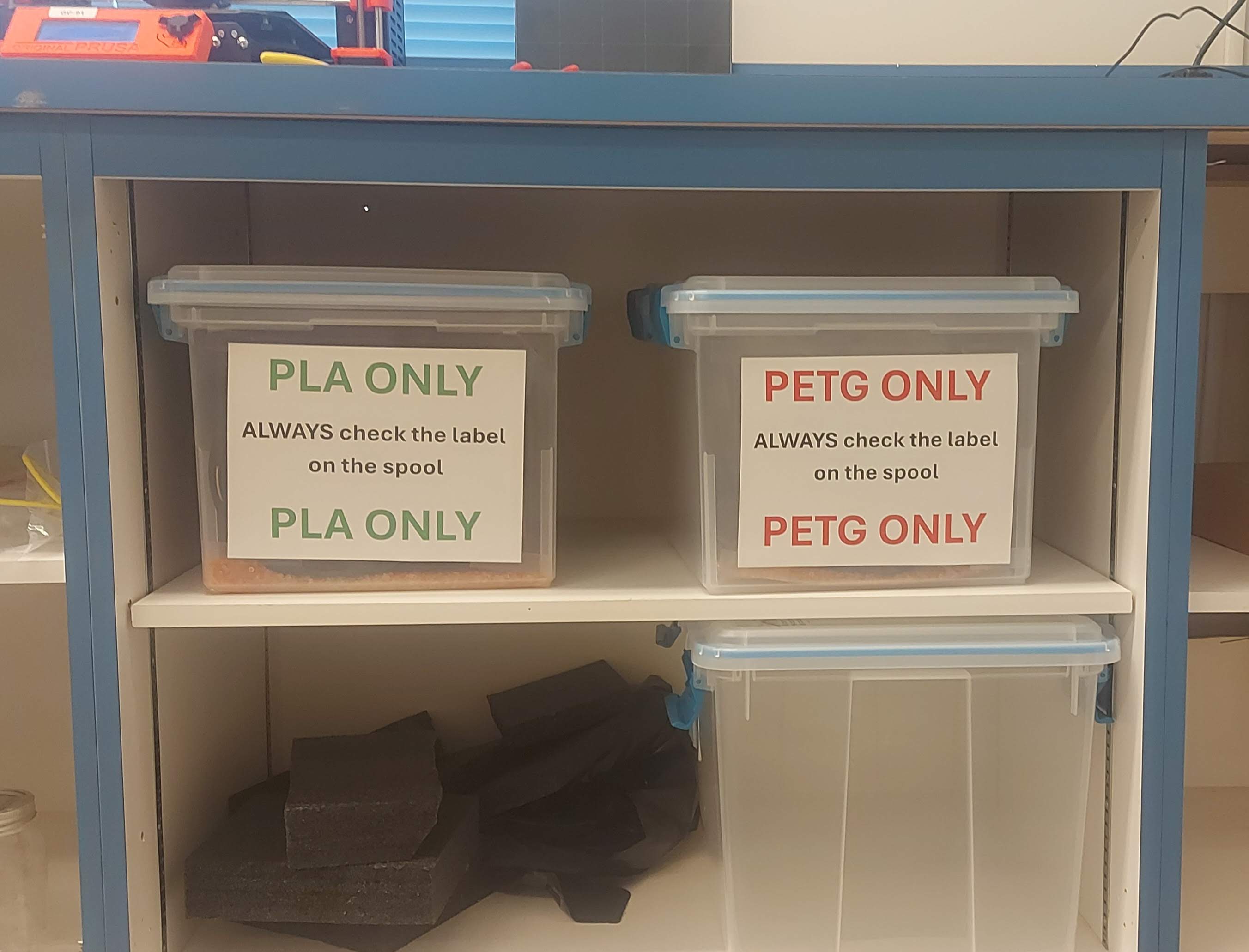 Please put the PETG filament in the PETG box and the PLA filament in the PLA box. Always check the label on the spool when you use filament regardless of which box you take it from. People make mistakes; someone might have returned their filament to the wrong box. PETG has a higher melting temperature than PLA. If you use PETG on PLA settings then the printer will jam. If you use the PLA on PETG settings then the flow will be too high and the bottom layer will remain liquid causing structural problems.